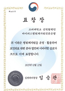 °í·Á´ëÇб³ ¹ÙÀÌ·¯½ºº´¿øÃ¼ÀÚ¿øÀü¹®ÀºÇà(ÀºÇàÀå °í·Á´ë ÀÇ´ë ¹Ì»ý¹°Çб³½Ç ¹Ú¸¸¼º ±³¼ö)ÀÌ ±¹³» ¹ÙÀÌ·¯½º º´¿øÃ¼ ÀÚ¿øÀÇ Ã¼°èÀûÀÎ ¿î¿µ°ú Ȱ¿ëÀ» ÅëÇØ ±¹°¡ º¸°ÇÀÇ·á ¹ßÀü¿¡ ±â¿©ÇÑ °ø·Î·Î ¡®Áúº´°ü¸®Ã»Àå ǥ⡯À» ¼ö»óÇß´Ù.