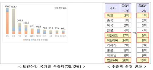 µ¶ÀÏÀÌ Ã³À½À¸·Î ¿ù°£ º¸°Ç»ê¾÷ ¼öÃâ 1À§±¹À¸·Î ¿Ã¶ó¼¹À¸¸ç, ³×´ú¶õµå(17¡æ5À§, 1.0¾ï ´Þ·¯, +484.2%), ÀÌÅ»¸®¾Æ(24¡æ6À§, 0.9¾ï ´Þ·¯, +860.3%) µî ¹ÙÀÌ¿ÀÀǾàǰ ¹× Áø´Ü¿ë½Ã¾à ¼öÃâÀÌ Å©°Ô Áõ°¡ÇÔ¿¡ µû¶ó ¼øÀ§°¡ »ó½ÂÇß´Ù.