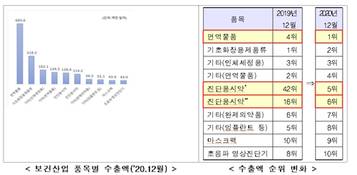 ÁøÈï¿ø »ê¾÷Åë°èÆÀ ½ÅÀ¯¿ø ÆÀÀåÀº ¡°12¿ù º¸°Ç»ê¾÷ ¼öÃâÀÇ ÁÖ¿ä Æ¯Â¡Àº ÀǾàǰ ¿ù°£ ¼öÃâ ÃÖÃÊ 10¾ï ´Þ·¯¸¦ µ¹ÆÄÇÏ¿´À¸¸ç ÀÇ·á±â±â´Â ÈÀåǰ ¼öÃâÀ» Á¦Ä¡°í ¼øÀ§°¡ »ó½ÂÇϴ Ư¡À» º¸¿´´Ù¡±¸ç, ¡°2020³âÀº ÀǾàǰ¡¤ÀÇ·á±â±â µî ¹æ¿ªÇ°¸ñÀ» Áß½ÉÀ¸·Î Å« ÆøÀÇ Áõ°¡¸¦ ±â·ÏÇÑ ÇÑÇØ·Î 16°³¿ù ¿¬¼Ó Ç÷¯½º ¼ºÀå°ú ´õºÒ¾î °¡ÆÄ¸¥ ¼ºÀå¼¼¸¦ À̾°í ÀÖ´Ù¡±°í Æò°¡Çß´Ù.