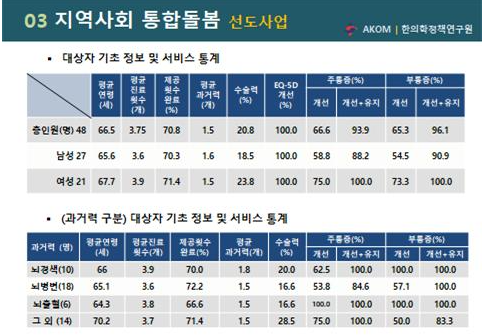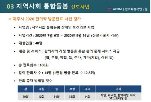À̾î, ÀÌ ¿øÀåÀº ÀÌ Áß¿¡¼ 2020³â 7¿ù 6ÀϺÎÅÍ 9¿ù 16ÀϱîÁö 48¸íÀÇ Àå¾ÖÀÎÀ» ´ë»óÀ¸·Î Á¦Áֽÿ¡¼ ½ÃÇàµÈ ¡®Áö¿ª»çȸ ÅëÇÕµ¹º½ Àå¾ÖÀÎ º¸°ÇÀÇ·á »ç¾÷¡¯ °á°ú¸¦ º¸°íÇϰí, ÇÑÀǾàÀ» Ȱ¿ëÇÑ ÅëÇÕµ¹º½ »ç¾÷ÀÇ ¶Ù¾î³ Ä¡·áÈ¿°ú¸¦ °ø°³Çß´Ù(¾Æ·¡ ±×¸² 1 ÂüÁ¶).
