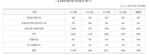ÀÀ±Þ½Ç ¿î¿µ±â°ü 504°³¼Ò´Â Æò¼Ò¿Í µ¿ÀÏÇÏ°Ô 24½Ã°£ Áø·á¸¦ Çϸç, ´Ù¼öÀÇ ¹Î°£ÀÇ·á±â°üÀÌ ¹®À» ´Ý´Â ¼³ ´çÀÏ(2.12.)¿¡µµ º¸°Ç¼Ò¸¦ ºñ·ÔÇÑ ÀϺΠ°ø°øº¸°ÇÀÇ·á±â°üÀº Áø·á¸¦ °è¼ÓÇÑ´Ù.