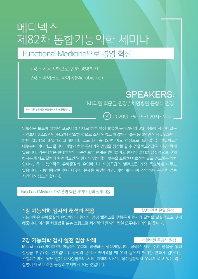 À̹ø ¼¼¹Ì³ª´Â 15ÀÏ ¿ÀÈÄ8½Ã ¸Þµð³Ø½º °ÀÇÀå¿¡¼ °³ÃÖµÇ¸ç ¡®Functional MedicineÀ¸·Î °æ¿µ Çõ½Å¡¯À» ÁÖÁ¦·Î ´ºÆ®¶óÁ¸ ¿¬±¸È¸¿Í ÅëÇÕ±â´ÉÄ¡À¯ÇÐȸ°¡ °øµ¿À¸·Î ÁÖÃÖÇÑ´Ù.
