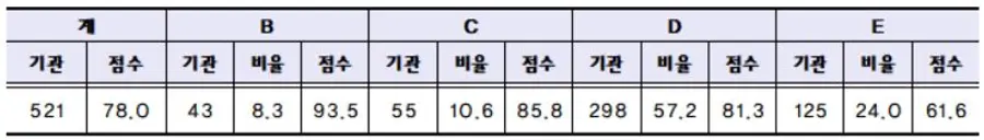 2021년 수시평가 평균점수는 78.0점으로 직전 평가 대비 12.9점 향상되었으며, 최하위기관 358개소 중 75.7%(271개소)가 등급이 상향됐다.