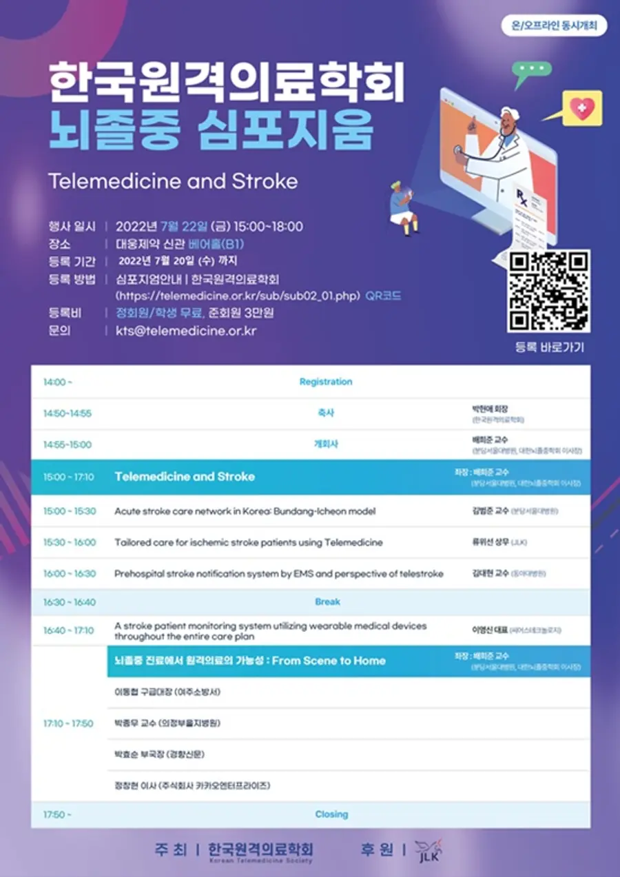 한국원격의료학회(회장 박현애, 서울대학교 간호대학교수)는 7월 22일 오후 3시부터 6시까지 대웅제약 신관 베어홀에서 ‘뇌졸중 원격의료 심포지엄’을 개최한다.