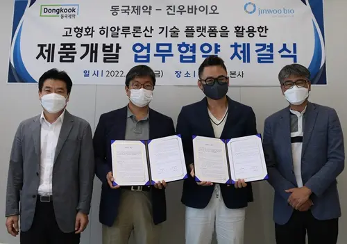 동국제약(대표이사 송준호)은 미용과 항노화 관련 핵심소재인 히알루론산(Hyaluronic Acid ; HA) 전문기업 진우바이오(대표이사 권동건)와 고형화 히알루론산 기술 플랫폼(Solid Hyaluronic Technology Platform ; SHTP)을 활용한 혁신제품 개발을 위해 업무협약(MOU)을 체결했다.