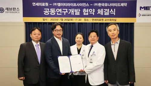 연세의료원(의료원장 윤동섭)이 최근 ㈜엠이티라이프사이언스(대표이사 육종인)와 ㈜한국유나이티드제약(대표이사 강덕영, 강원호)과 함께 ‘난치성 폐섬유증 치료를 위한 나노메디슨 플랫폼 치료기술 개발’을 위한 공동연구개발 협약을 체결했다.