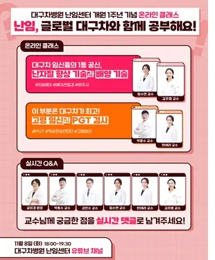 차 의과학대학교 글로벌 난임센터 대구차병원(원장 궁미경)이 오는 11월 8일(화요일) 오후 6시 개원 1주년을 기념해 유튜브 (https://www.youtube.com/daegu_cha) 라이브 클래스 ‘난임, 글로벌 대구차병원과 함께 공부해요!’를 진행한다.