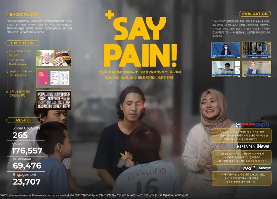 ‘SAY PAIN!’ 캠페인은 아픔을 참지 말라는 슬로건으로, 인도네시아 발달장애인이 질병 증상을 제대로 표현하고 치료받을 수 있는 환경 구축에 기여하기 위해 인도네시아에서 진행한 사회공헌 캠페인이다.