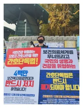이날 1인시위에는 치협 홍수연 대외협력담당 부회장이 참여했다. 홍 부회장은 지난 10월 12일과 19일에도 간호법 폐기를 위한 1인시위에 나선 바 있다.