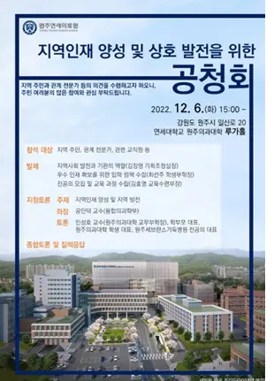 연세대학교 원주연세의료원(의료원장 백순구)이 오는 12월 6일 오후 3시 연세대학교 원주의과대학 루가홀에서 ‘지역인재 양성 및 상호 발전을 위한 공청회’를 개최한다.