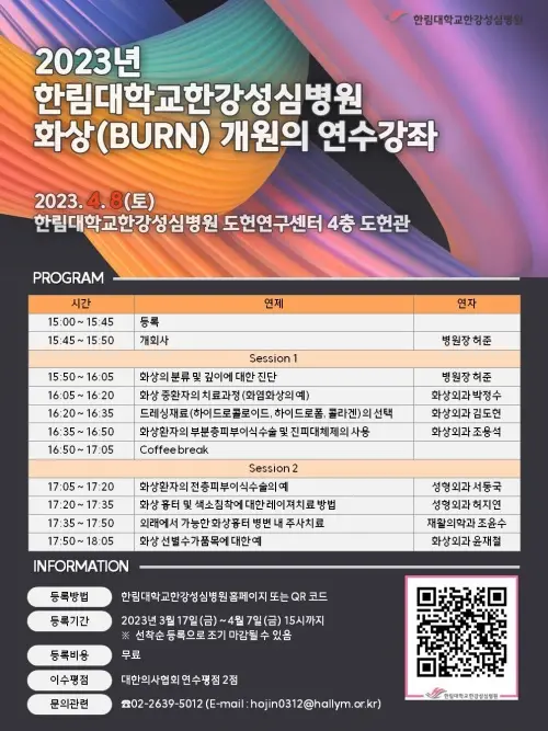 이번 강좌에서는 한림대학교한강성심병원 화상외과, 성형외과, 재활의학과 교수가 화상의 진단, 치료, 수술 등 임상에 필요한 내용을 폭넓게 다룬다. 첫 번째 세션에서는 화상의 분류 및 진단을 주제로 ▲화상의 분류 및 깊이에 대한 진단 ▲화상 중환자의 치료과정 ▲드레싱 재료의 선택 ▲화상환자의 부분층피부이식수술 및 진피대체제 사용에 대한 강좌가 진행된다.