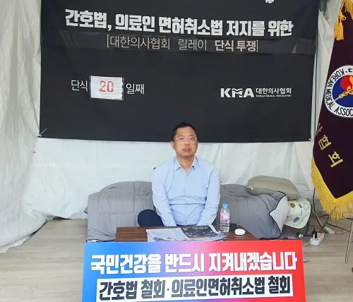국무회의가 개최된 16일 오전에도 보건복지의료연대의 의료악법 저지를 위한 릴레이 단식 투쟁이 대한의사협회 회관 앞 천막농성장에서 20일째 이어졌다.