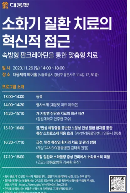 행사는 대웅펫 이효준 대표의 소개말을 시작으로 ▶개 지방변 진단과 치료의 최신 지견(강원대학교 안주현 교수) ▶급.만성 췌장염을 동반한 노령성 만성 질환 환자를 통한 췌장 소화효소제 적용 효과(VIP반려동물암센터 임윤지 원장) ▶급성, 만성 췌장염 환자의 치료 및 관리 방향(계양 24시SKY동물병원 김태희 원장) ▶췌장 질환과 소화불량 증상 관리에서 소화효소의 역할(굿모닝펫동물병원 장봉환 원장) 순으로 강의한다.