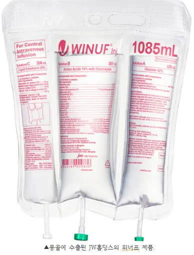 JW홀딩스는 몽골 아시아파마(AsiaPharma LLC)에 3체임버 종합영양수액제 ‘위너프 센트럴 736·1085㎖(이하 위너프)’를 본격 수출한다.