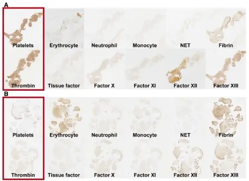 연구 결과, 암과 연관된 뇌졸중 환자의 혈전은 일반적인 뇌졸중 환자의 혈전에 비해 혈소판, 트롬빈, 조직인자 등의 분율이 유의미하게 높았고 상대적으로 적혈구의 비중은 낮았다. 또한, 암과 연관된 뇌졸중 환자의 혈전에서만 혈소판과 트롬빈 사이의 유의미한 상관관계를 발견했다.
