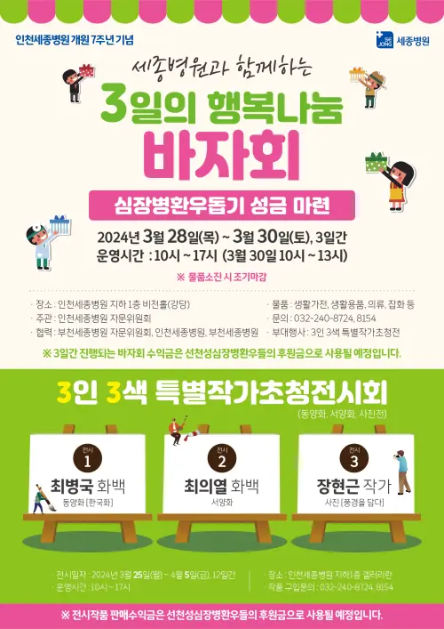 인천세종병원(병원장 오병희)은 개원 7주년을 맞아 심장병 환우 돕기 성금 마련을 위한 바자회, 전시회 등 다채로운 후원 행사를 진행한다.