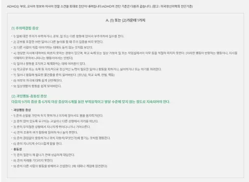 ADHD의 진단은 대한소아청소년정신의학회나 ADHD 홈페이지에 게시되어 있는 자가진단표를 통해 가정에서도 쉽게 파악해 볼 수 있다. ADHD는 주의력결핍형과 과잉행동충동형으로 나뉘는데 각각 9가지 검사 항목 중 6개 이상에 해당하는 아이는 ADHD가 의심된다고 볼 수 있어 바로 병원을 방문해야 한다.