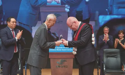 ▲ 故 도헌 윤대원 이사장(왼쪽)이 안데스 하그펠트 스웨덴 웁살라대학교 총장(오른쪽)으로부터 린네 골드메달을 받는 모습
