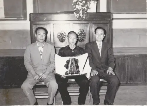 ▲용산중학교 재학시절 생물 채집단 활동을 바탕으로 ‘전국학생생물연구발표회’ 1등상을 수상한 故 도헌 윤대원 이사장 모습(가운데). 왼쪽은 그의 선친 故 일송 윤덕선 명예이사장.