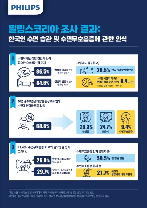 이번 조사는 필립스코리아가 한국리서치에 의뢰해 전국 성인 남녀 2,000명을 대상으로 실시되었다. 조사 결과, 응답자의 대다수가 수면이 신체건강(86.5%)과 정신건강(84.6%)에 중요한 요소라고 답했지만 정작 주중 평균 수면 시간은 6.4 시간에 불과했고, 수면에 만족하는 비율은 29.5%에 그쳤다. 또한 68.6%가 불면증(29.3%)이나 코골이(24.7%), 수면무호흡증(9.4%) 등의 증상으로 수면에 방해를 받고 있는 것으로 나타났다.