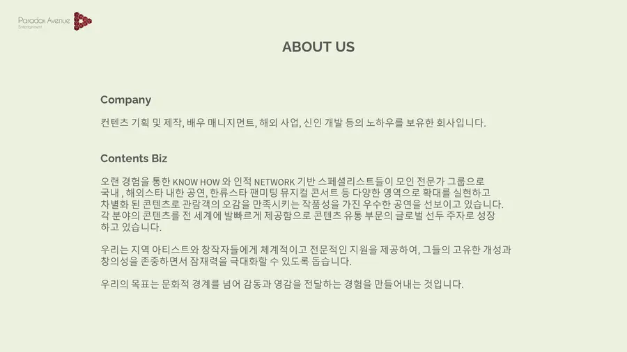 이번에 전속 협약을 맺은 (주)파라독스에비뉴는 콘텐츠 기획 및 제작, 배우 매니지먼트, 해외 사업, 신인 발굴과 개발 등 엔터테인먼트 산업 전반에 걸친 풍부한 노하우를 보유한 전문 기업이다. 오랜 경험을 통해 축적된 실무 지식과 탄탄한 인적 네트워크를 기반으로 각 분야의 스페셜리스트들이 모인 전문가 그룹으로 업계의 주목을 받고 있다.