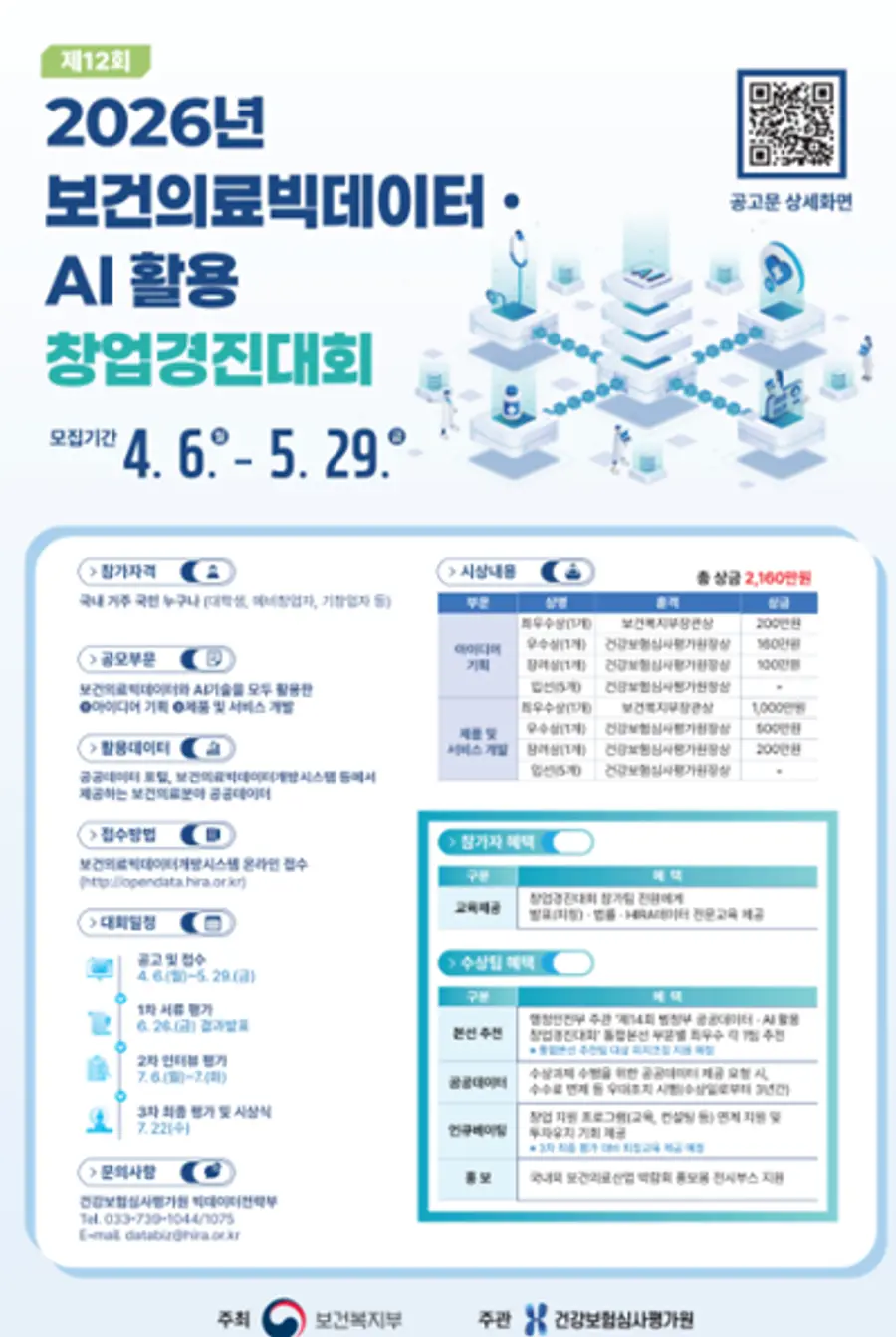 건강보험심사평가원(원장 강중구, 이하 심평원)은 보건의료빅데이터‧인공지능(AI)을 활용한 창의적인 비즈니스 모델 발굴을 위해 ‘2026년 보건의료빅데이터‧AI 활용 창업경진대회(이하 대회)’를 개최한다.