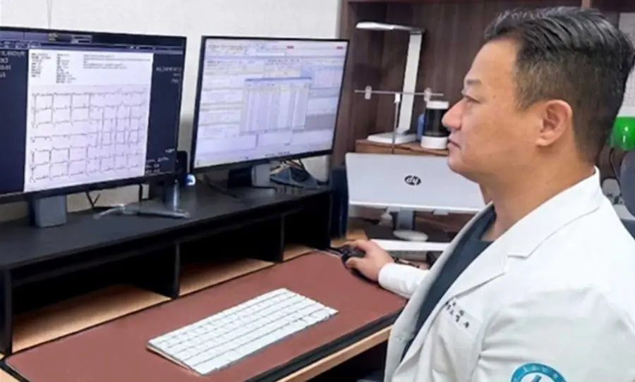 ▲조영욱 운암한국병원 병원장이 AI 심전도 분석 소프트웨어 ‘에티아(AiTiA)’ 결과를 확인하고 있다.