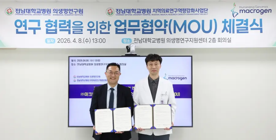 글로벌 AI 유전체 분석 기업 마크로젠은 전남대학교병원 의생명연구원과 8일 차세대염기서열분석(NGS) 기반 정밀의료 연구 역량 강화를 위한 업무협약(MOU)을 체결했다.