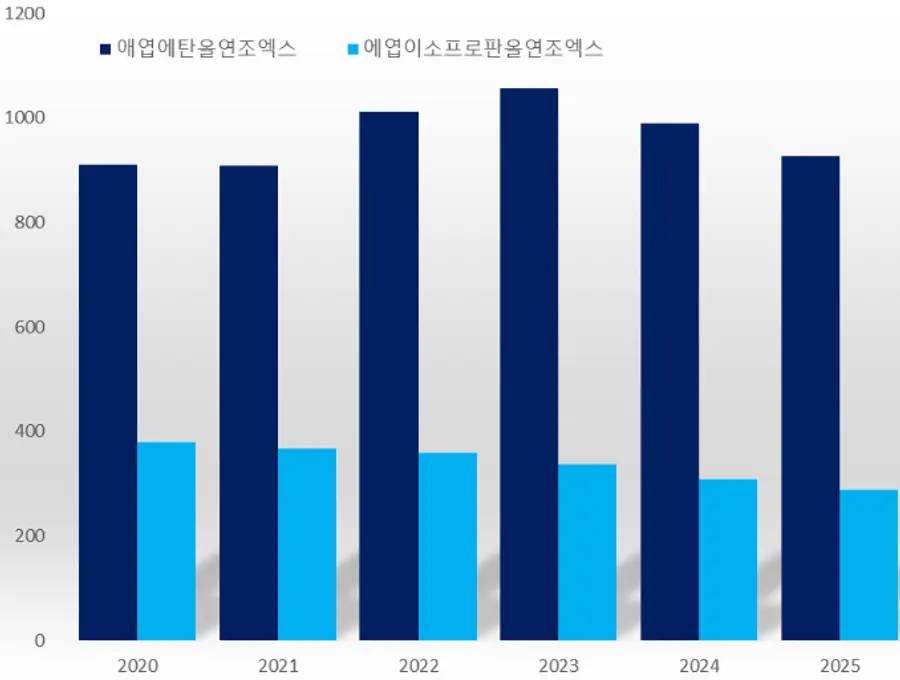 작년 에탄올을 용매로 사용한 애엽에탄올건조엑스의 처방액은 928억원으로 전체시장의 76.3%에 달했다.