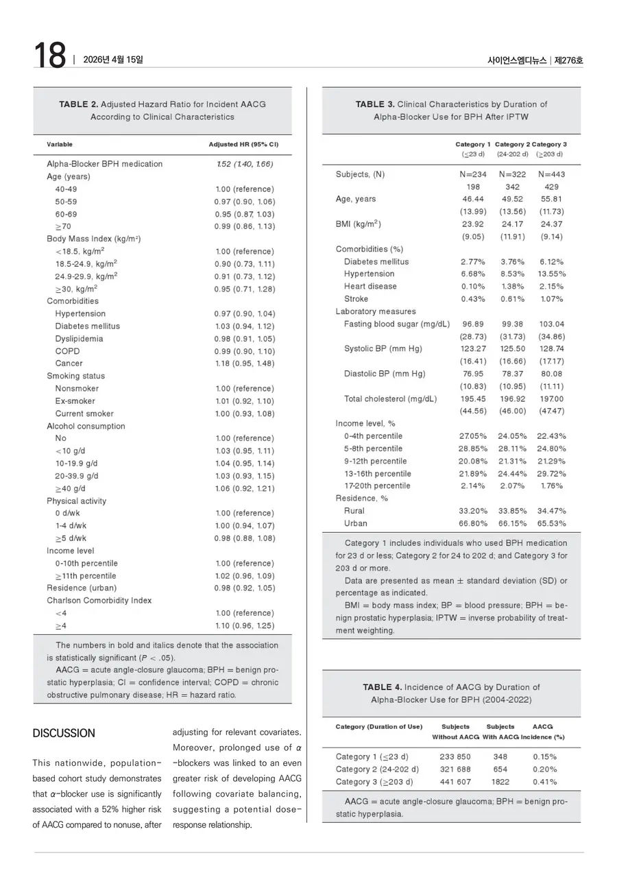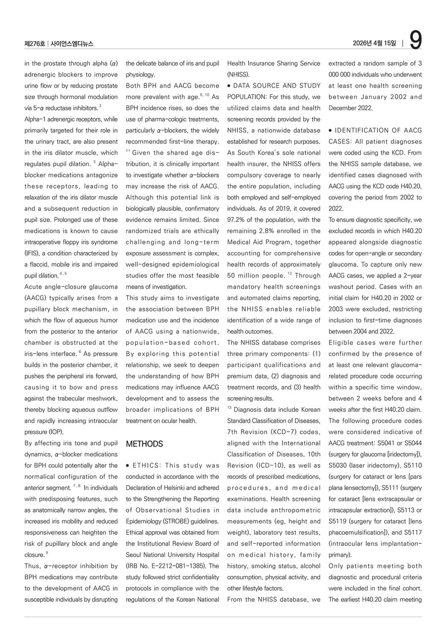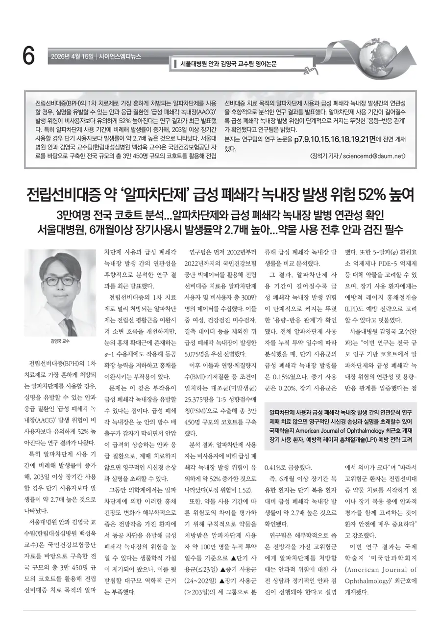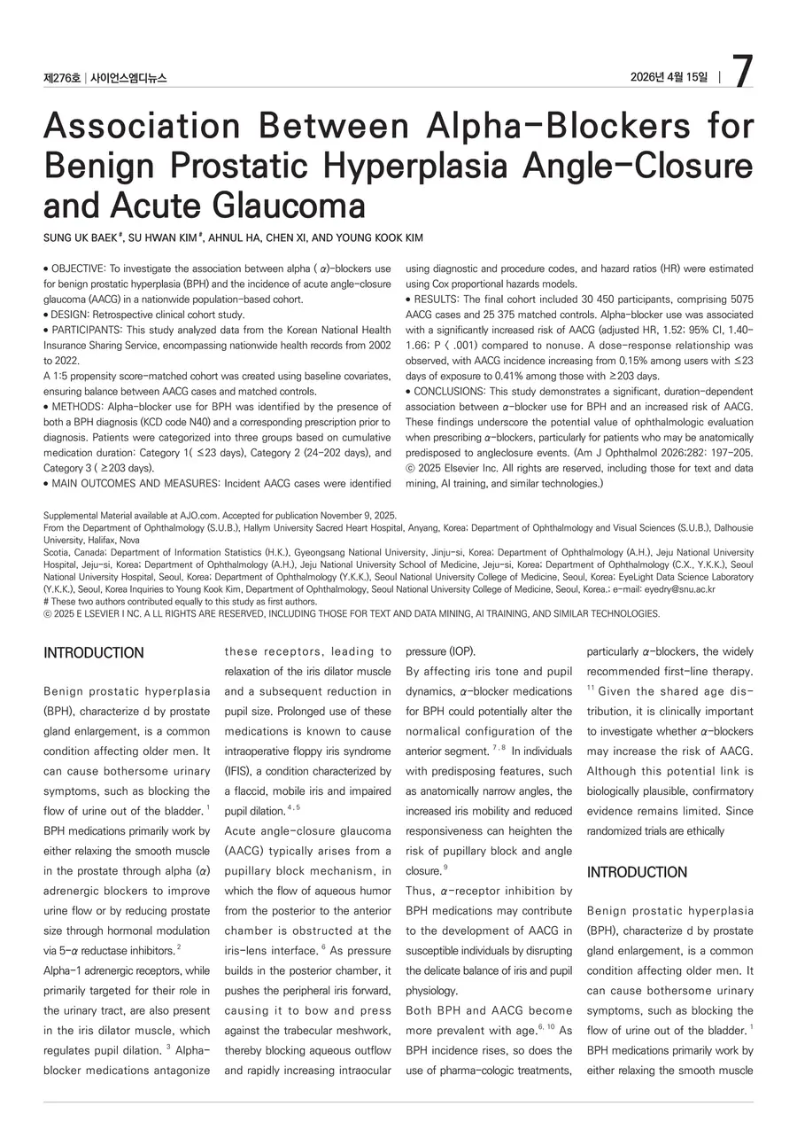 이번 호의 메인 임상 특집은 서울대병원 안과 김영국 교수팀(공동 1저자 백성욱 교수)의 연구로, 전립선비대증(BPH) 1차 치료제인 알파차단제 사용이 급성 폐쇄각 녹내장(AACG) 위험을 유의하게 증가시킨다는 대규모 코호트 분석이다.