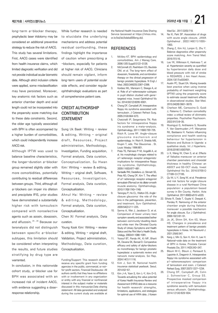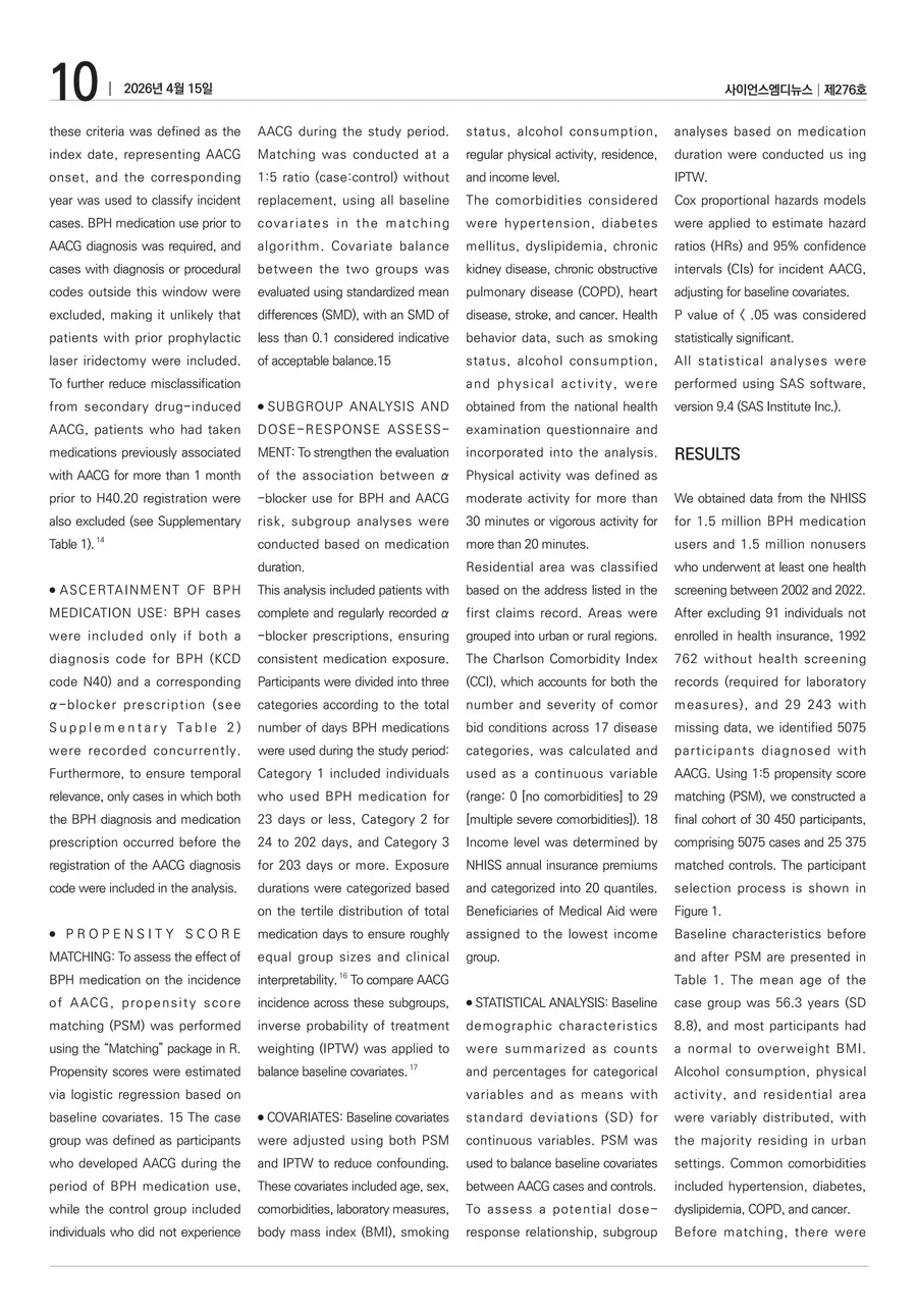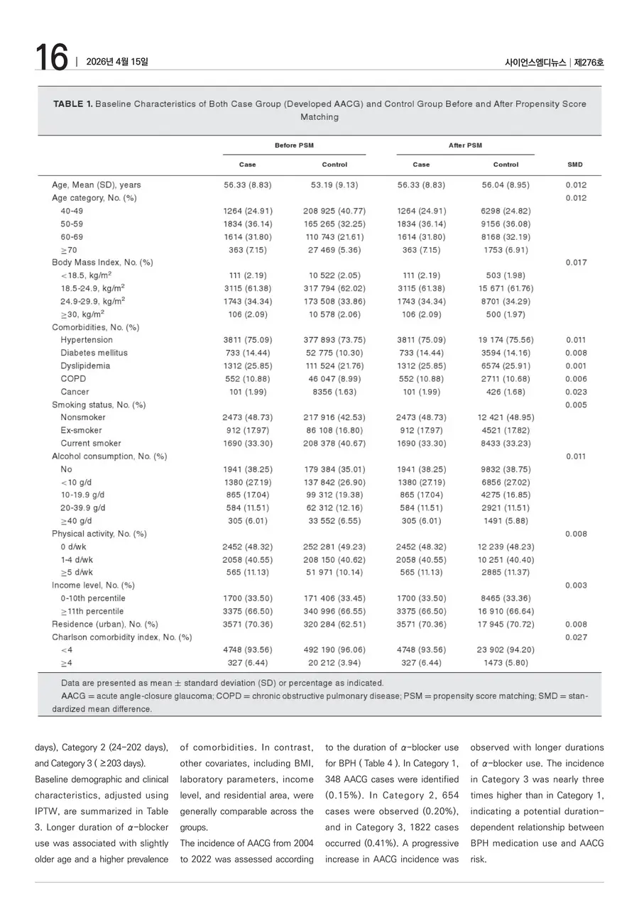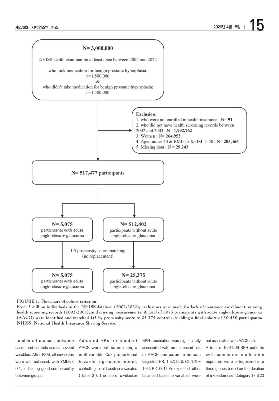 이번 호의 메인 임상 특집은 서울대병원 안과 김영국 교수팀(공동 1저자 백성욱 교수)의 연구로, 전립선비대증(BPH) 1차 치료제인 알파차단제 사용이 급성 폐쇄각 녹내장(AACG) 위험을 유의하게 증가시킨다는 대규모 코호트 분석이다.