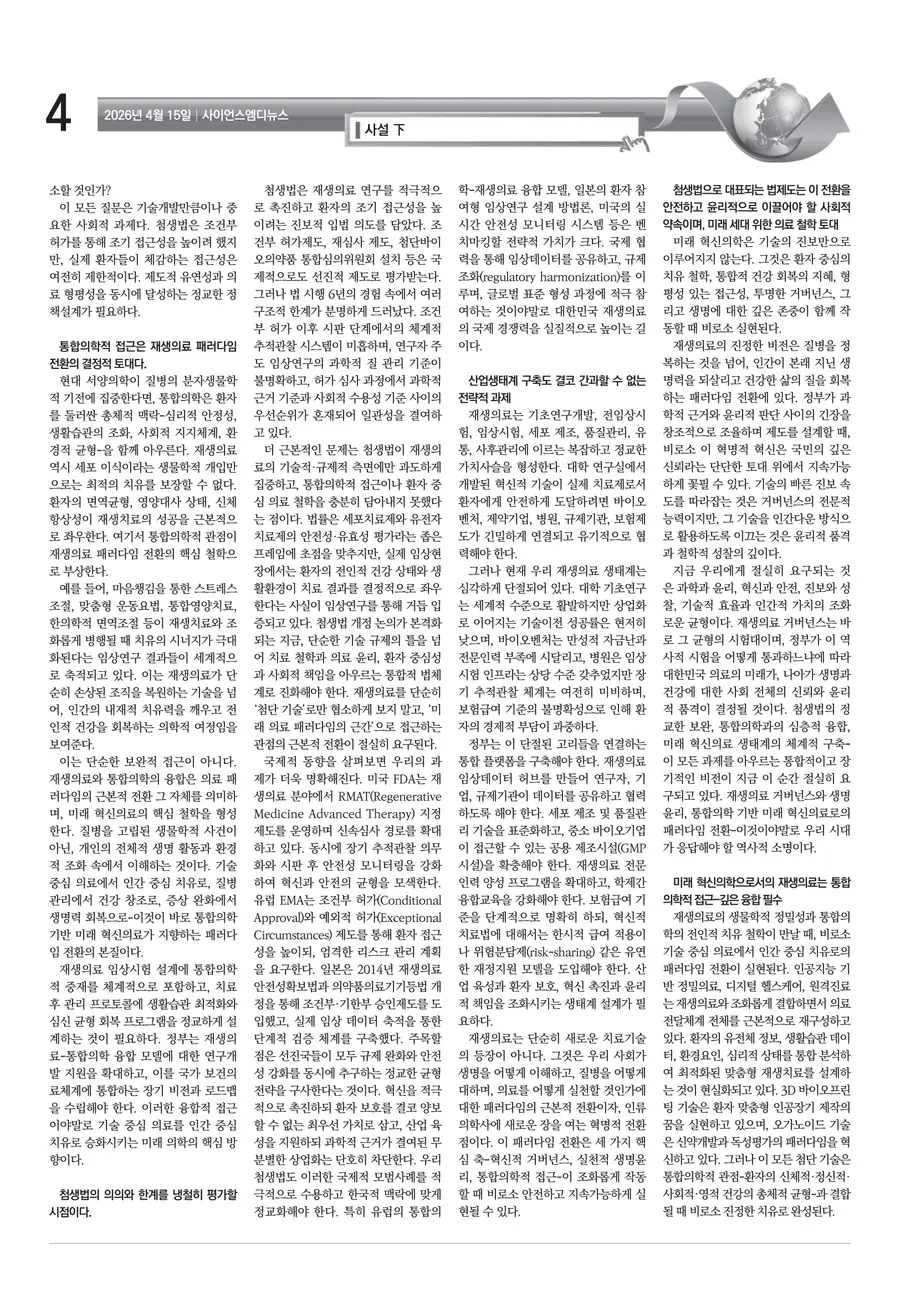 지면 사설은 줄기세포·유전자편집·조직공학 등 재생의료 기술이 난치질환 치료에 새로운 희망을 열고 있지만, 기술 도입 속도에 비해 제도·윤리·철학적 준비가 뒤처져 있다고 지적한다.