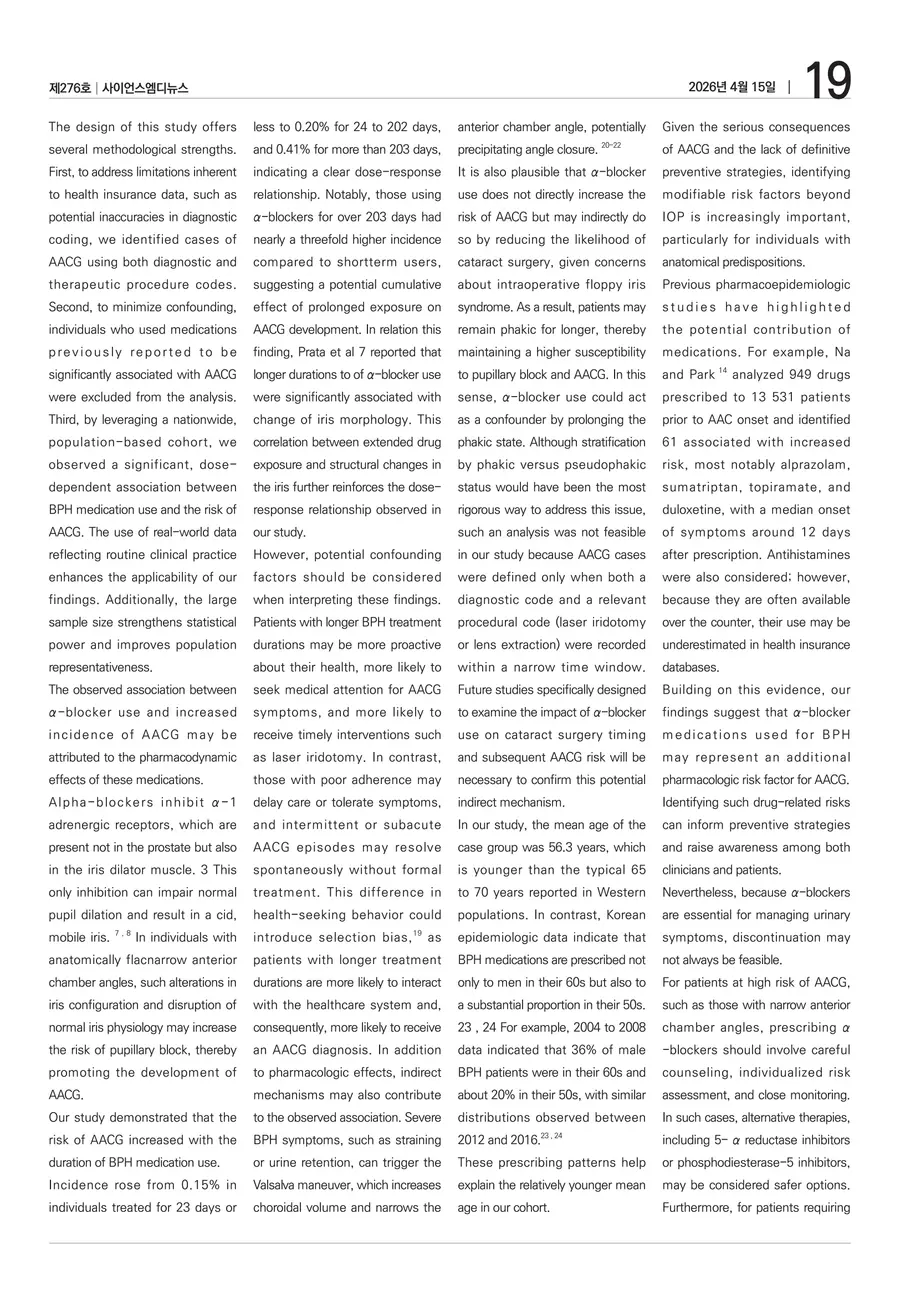 연구팀은 알파차단제가 전립선 평활근뿐 아니라 홍채 확대근의 α1 수용체를 차단해 동공 반응과 홍채 긴장도를 변화시키며, 해부학적으로 전방각이 좁은 환자에서 AACG를 촉발할 수 있다고 설명했다.