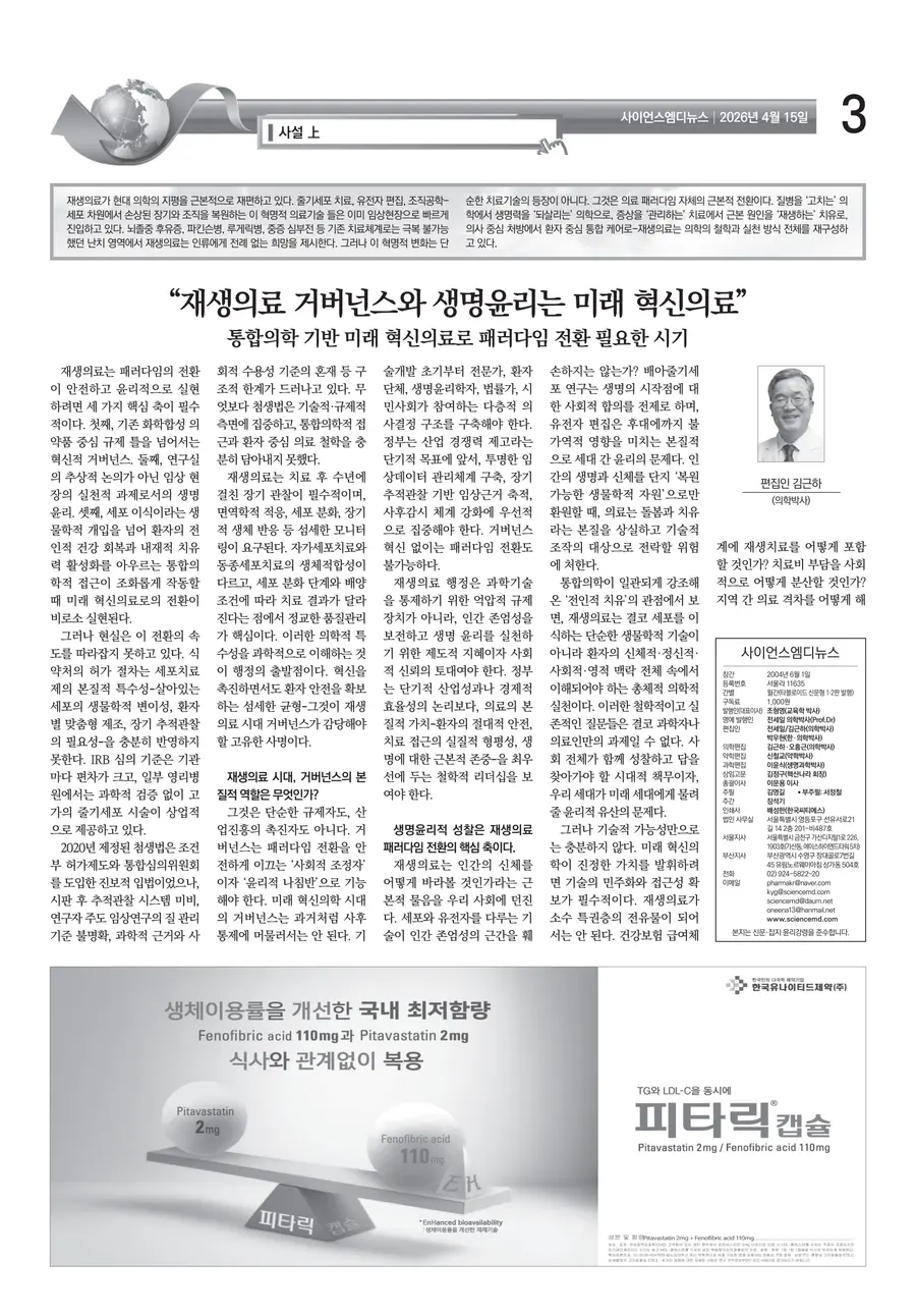 ‘사이언스엠디뉴스’ 제276호(2026년 4월 15일자)는 재생의료 거버넌스와 통합의학, 제약·바이오 산업 동향을 중심으로 현대 의료의 패러다임 전환을 강하게 촉구하고 있다.