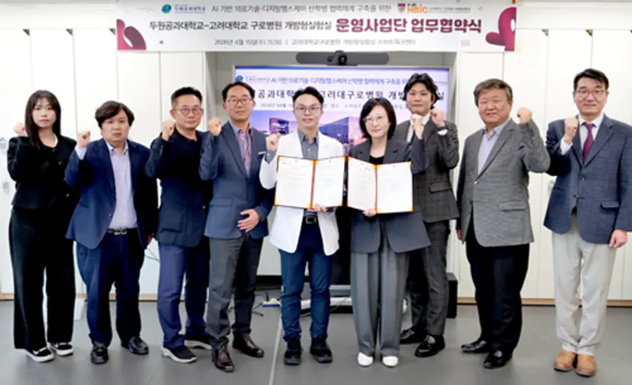 고려대학교 구로병원 개방형실험실 운영사업단(단장 김치경 신경과 교수)이 두원공과대학교(총장 강건용)와 손잡고 AI 기반 의료기술 및 디지털헬스케어 분야에서 AX(AI Transformation) 전환과 데이터 기반 산학병 협력체계 구축에 나선다.