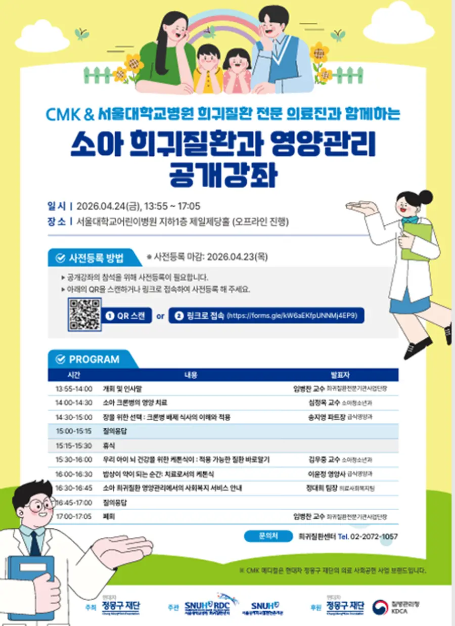 현대차 정몽구 재단(이사장 정무성)이 주최 및 후원하고, 서울대학교병원 희귀질환센터와 서울권역희귀질환전문기관이 주관하며, 질병관리청이 후원하는 「CMK & 서울대학교병원 희귀질환 전문 의료진과 함께하는 소아 희귀질환과 영양관리 공개강좌」가 2026년 04월 24일 서울대학교어린이병원 지하 1층 제일제당홀에서 개최된다.