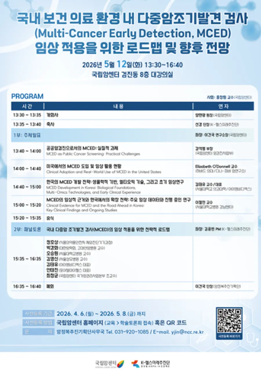 국립암센터(원장 양한광)와 한국보건산업진흥원 K-헬스미래추진단(단장 선경)은 오는 5월 12일(화) 오후 1시 30분 국가암예방검진동 8층 대강의실에서 ‘국내 보건의료환경 내 MCED 임상적용을 위한 로드맵 및 향후 전망’을 주제로 제83회 암정복포럼을 공동 개최한다.
