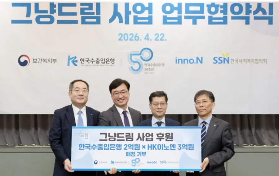 이는 공동으로 재원을 조성하는 매칭기부형 사업으로, HK이노엔은 자사 음료 제품인 ‘새싹보리’ 3억 원 상당(약 12만 병)을 지원하고, 한국수출입은행은 이에 맞춰 2억 원을 기부, 복지 수요에 맞는 총 5억 원 상당의 꾸러미를 전달한다.