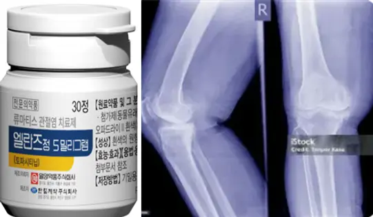 ▲일양약품 신제품 류마티스 관절염 치료제 ‘엘란즈정 5밀리그램’과 관절염 사진.