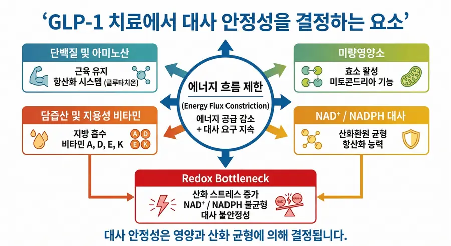 [그림] GLP-1 치료 시 대사 안정성을 결정하는 핵심 요소. 비만약 투여로 인한 ‘에너지 흐름 제한’ 상태에서 단백질·미량영양소 등 4대 자원의 불균형이 심화되면, 체내 해독 한계점인 ‘산화 환원 대사의 병목현상’이 발생해 대사 불안정성을 초래한다.