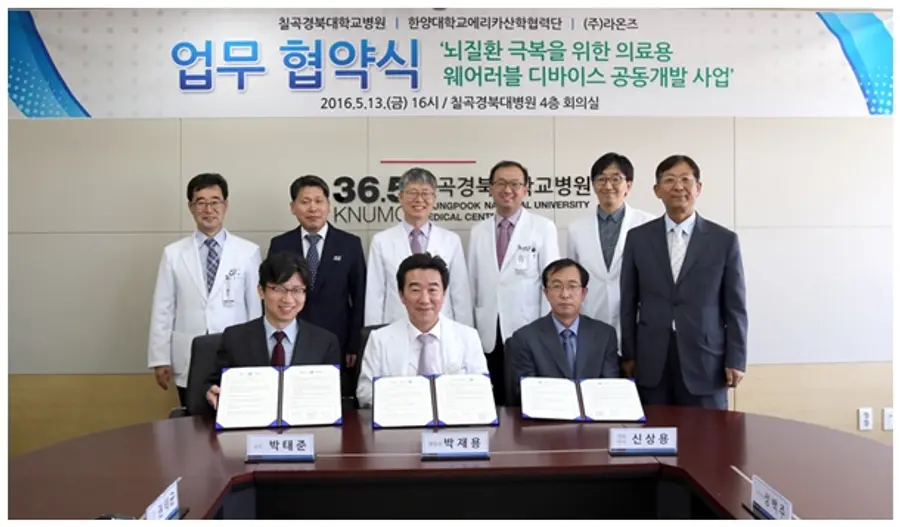 칠곡경북대학교병원 뇌신경센터 연구팀 (신경과 이호원, 강경훈, 고판우 교수)과 한양대학교 로봇공학팀(박태준 교수)은 지난 13일(금) 칠곡경북대학교병원에서 바이오메디컬 장비기업 (주)라온즈와 노인성 뇌질환의 진단 및 치료용 ‘웨어러블디바이스’개발을 위한 업무협약을 체결했다.