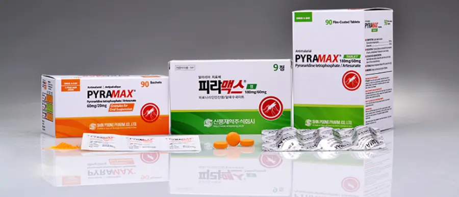 ▲ 신풍제약이 개발한 글로벌신약 말라리아치료제 ‘피라맥스정’과 ‘피라맥스과립’.