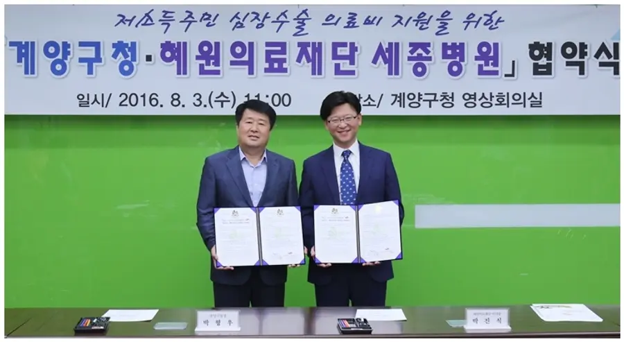 계양구청 영상회의실에서 진행한 이날 협약식에는 세종병원 박진식 이사장, 이명묵 병원장, 박형우 계양구청장, 윤인숙 주민생활지원국장 외 주요 관계자가 참석했으며, 양 기관은 저소득 주민을 위한 심장수술 의료비 지원을 함으로써 일상생활에 안정을 도모하고, 삶의 질 향상에 기여하는데 의견을 모았다.