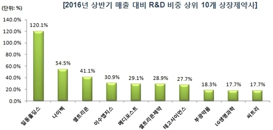 이어 매출 대비 R&D 비중이 높은 회사는 나이벡(54.5%)., 셀트리온(41.1%)., 이수앱지스(30.9%), 메디포스트(29.1%), 셀트리온제약(28.9%), 테고사이언스(27.7%) 등으로 대부분 바이오제약사들이 차지했다.