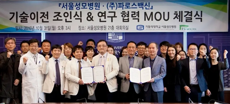 가톨릭대학교 서울성모병원(병원장 승기배 교수)과 ㈜파로스백신(대표이사 제정욱, 이현수)은 지난 10월 31일 오후 3시 병원 본관 21층 VIP회의실에서 임상 연구 협력을 위한 상호협력 양해각서(MOU) 체결식을 가졌다.