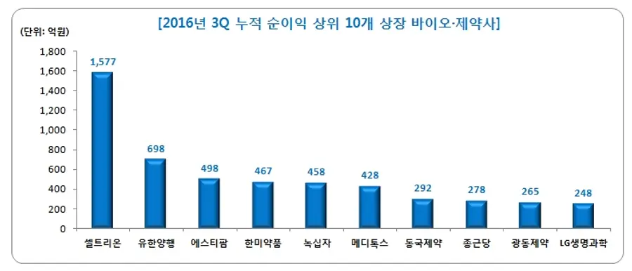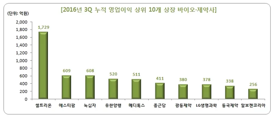 영업이익이 가장 높았던 회사는 셀트리온(1729억원)이었으나 에스티팜, 녹십자, 유한양행, 메디톡스 등이 뒤를 이었다. 순이익이 가장 높았던 회사 역시 셀트리온(1577억원)이었으며, 유한양행, 에스티팜, 한미약품, 녹십자 등의 순으로 높았다.