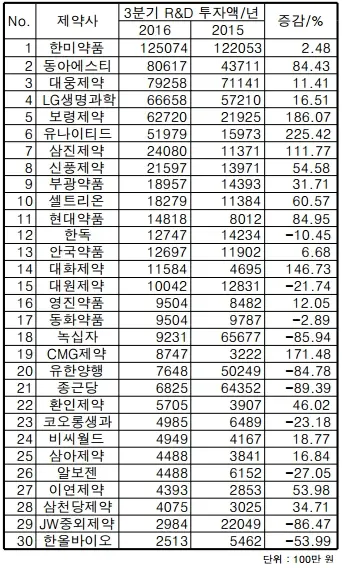 1~30위 제약사 까지의 R&D투자액은 표와 같다.