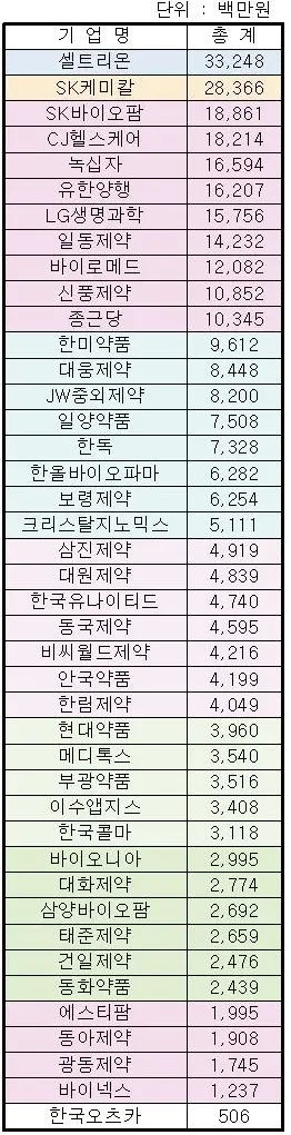 그러나 퀀텀프로젝트 등으로 수조원의 기술 수출을 실현한 ▶한미약품은 96억원, ▶대웅제약은 84억원, ▶JW중외제약 82억원, ▶일양약품 75억원, ▶한독 73억원, ▶한올바이오파마 62억원, ▶보령제약 62억원, 크리스탈지노믹스 51억원 등이 50억원 이상을 받은 것으로 나타났다.