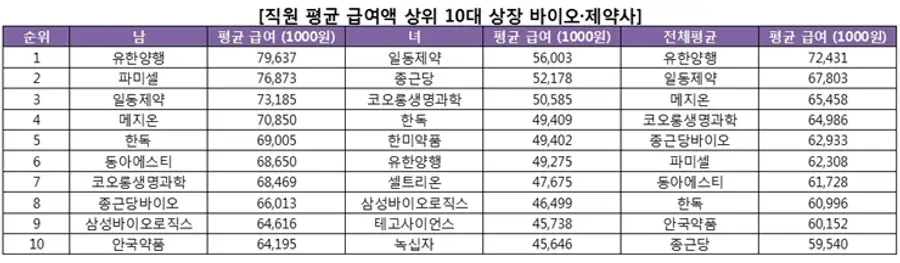 직원 1인 평균 급여액은 유한양행이 7243만원으로 가장 많았고, 일동제약(6780만원), 메지온(6549만원), 코오롱생명과학(6499만원), 종근당바이오(6293만원), 파미셀(6231만원), 동아에스티(6173만원), 한독(6100만원), 안국약품(6015만원), 종근당(5954만원) 등이 뒤를 이었다.