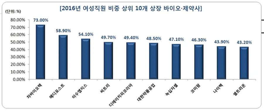 여성 직원의 비중이 가장 높은 회사는 차바이오텍으로 전체 직원수의 73.0%가 여성이었다.
